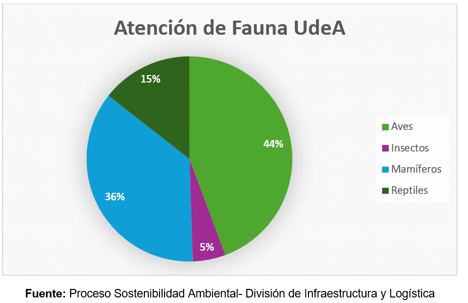 La Fauna que habita los Campus de la Universidad de Antioquia, incluyendo aves, mamíferos, reptiles y anfibios, interactúan activamente con la infraestructura y las actividades humanas dentro de los campus universitarios. Desde el proceso de Sostenibilidad Ambiental Adscrito a la División de Infraestructura y Logística se realiza el direccionamiento y atención primaria de fauna silvestre de manera responsable, segura y efectiva a individuos juveniles, heridos, desorientación o en estado de vulnerabilidad, facilitando el direccionamiento adecuado, el acopio temporal y la articulación con las autoridades ambientales competentes para la atención primaria. Todo ello bajo un enfoque de bienestar animal, prevención de riesgos y compromiso con la biodiversidad.