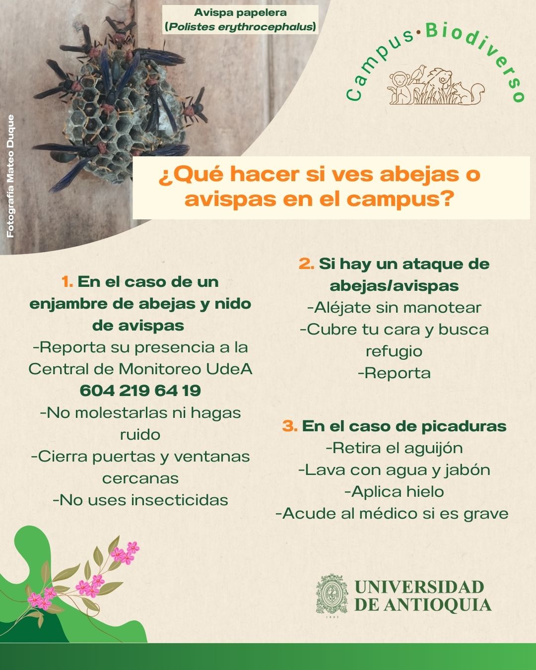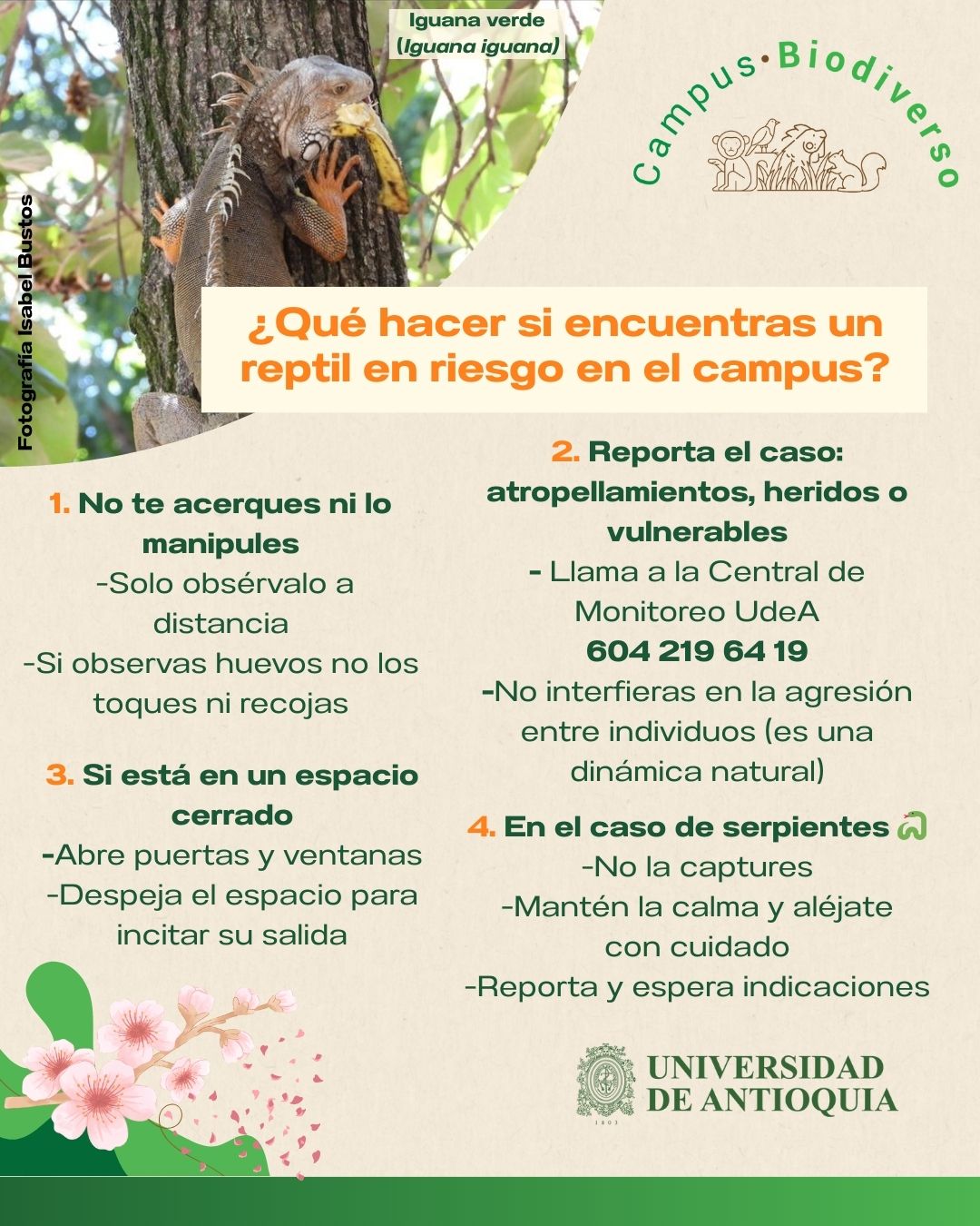 Con el fin de fortalecer el compromiso con la biodiversidad del campus, se presentan estas e-card informativas para orientar a la comunidad universitaria sobre cómo actuar de manera responsable y segura frente a aves, mamíferos, reptiles y abejas en caso de incidentes dentro de los campus universitarios.