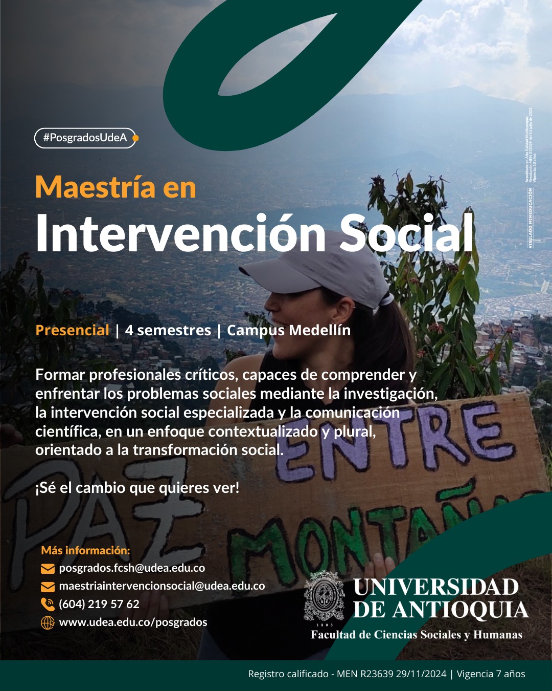 La Facultad de Ciencias Sociales y Humanas de la Universidad de Antioquia se complace en convocar a la Maestría en Intervención Social, en la modalidad de investigación. Este programa es liderado por el Departamento de Trabajo Social y cuenta con el respaldo de los grupos de investigación: Intervención Social (GIIS), Cultura, Política y Desarrollo Social, Género, Subjetividad y Sociedad, Estudios Interculturales y Decoloniales, Medio Ambiente y Sociedad, y Psicología, Sociedad y Subjetividades, todos pertenecientes al Centro de Investigación Sociales y Humanas.