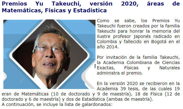 Mención de honor a tesis doctoral en el Premio Yu Takeuchi de la Academia Colombiana de Ciencias Exactas, Físicas y Naturales