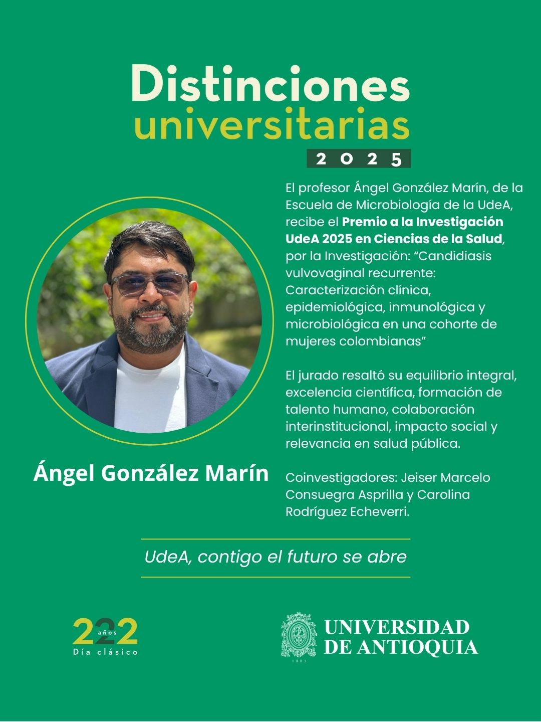 Profesor Ángel González Marín recibe Premio a la Investigación UdeA 2025 en Ciencias de la Salud