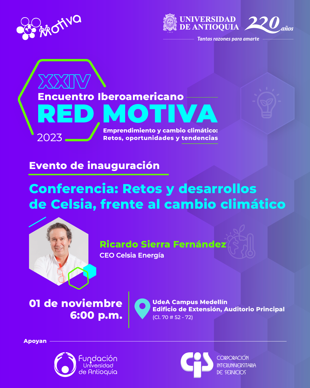 updated Apr 6, 2021Este año la Universidad de Antioquia, en el marco de sus 220 años, será la sede del XXIV Encuentro de la Red Motiva que se realizará del 1 al 3 de noviembre en la ciudad Medellín – Colombia, hoy Distrito Especial de Ciencia, Tecnología e Innovación. El encuentro se centrará en el cambio climático y el emprendimiento, temática que permitirá analizar el rol de las instituciones frente a este fenómeno y reconocer retos, oportunidades y tendencias del emprendimiento para ofrecer soluciones medioambientales.