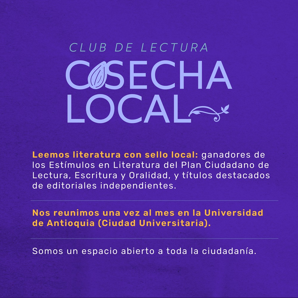 El Club de Lectura Cosecha Local es una alianza entre el Plan Ciudadano de Lectura, Escritura y Oralidad (PCLEO) y Bienestar Cultural de la Universidad de Antioquia (UdeA), que promueve el acceso y bienestar entorno a la lectura y conversación de obras literarias locales destacadas.