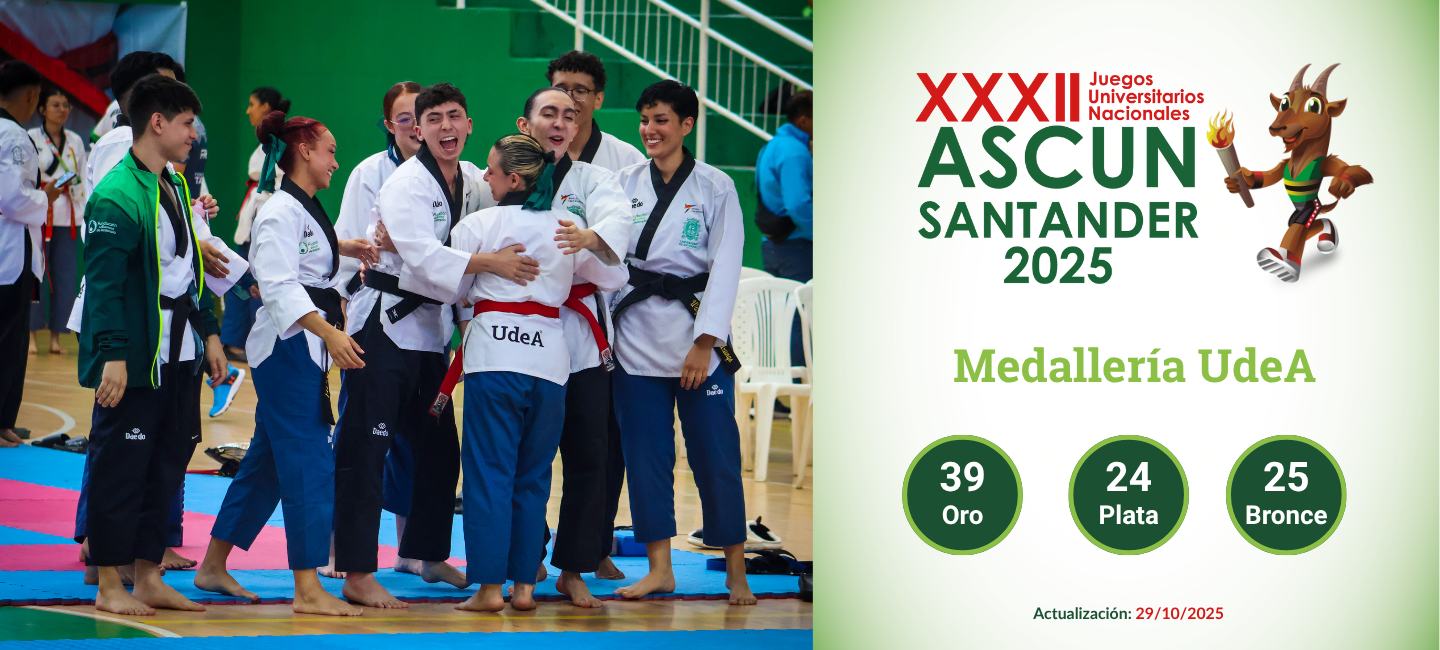 ¡La UdeA, a defender el título general en los Juegos Universitarios Nacionales 2025! Entre el 17 y el 31 de octubre, el equipo de la Alma Máter, conformado por 320 personas, participará en los Juegos Universitarios Nacionales 2025 que tendrán sede en el departamento de Santander. En esta edición del certamen competirán alrededor de 5600 deportistas de 126 universidades de todo el país. La UdeA defenderá el título alcanzado en 2024, donde obtuvo 112 medallas: 36 de oro, 35 de plata y 41 de bronce, ocupando el primer lugar del medallero.