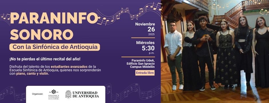 Paraninfo Sonoro con la Sinfónica de Antioquia es un espacio que parte del principio integrador de la cultura, a través de una de sus expresiones artísticas por excelencia: la música. Los últimos miércoles de cada mes, a las 5:30 p.m., los estudiantes avanzados de la Escuela y sus maestros, serán los encargados de hacer que el piano, anfitrión permanente de este espacio, eleve sus sonidos para enaltecer uno de los lugares universitarios más emblemáticos, el Paraninfo, Aula Máxima de la Universidad de Antioquia.