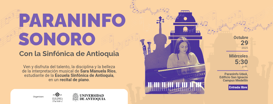 Paraninfo Sonoro con la Sinfónica de Antioquia es un espacio que parte del principio integrador de la cultura, a través de una de sus expresiones artísticas por excelencia: la música. Los últimos miércoles de cada mes, a las 5:30 p.m., los estudiantes avanzados de la Escuela y sus maestros serán los encargados de hacer que el piano, anfitrión permanente de este espacio, eleve sus sonidos para enaltecer uno de los lugares universitarios más emblemáticos, el Paraninfo, Aula Máxima de la Universidad de Antioquia.