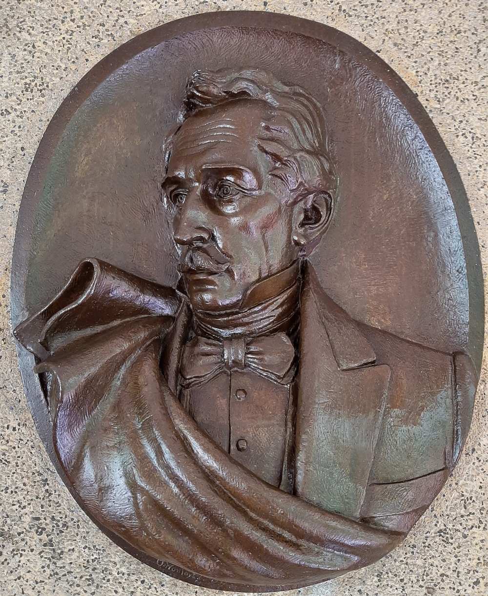 Realizado por Octavio Montoya en 1959, con motivo de su liderazgo indiscutible de la educación en el país. La influencia de las ideas liberales de Santander se dejaron sentir en el ámbito educativo nacional. Francisco de Paula Santander nació en Cúcuta en 1792, hijo de una familia perteneciente a las elites criollas y con varias posesiones territoriales. Culminó sus estudios de Derecho en la Universidad Santo Tomás de Bogotá en el año de 1810. A partir de este momento, se uniría como voluntario a las filas patrióticas y ascendería de grado rápidamente. En 1813, Bolívar le encomienda la defensa de las zonas aledañas a Cúcuta y tras su derrota se ve obligado a marchar hacia Venezuela. Allí participaría, junto a Bolívar, en el inicio de la denominada Campaña Admirable. Santander jugó un papel muy destacado en la campaña de los Llanos, la batalla del Pantano de Vargas y en la Batalla de Boyacá de 1919. Fue elegido vicepresidente de Colombia en 1821, manteniéndose en cargo del poder ejecutivo mientras Bolívar realizaba las campañas del Sur para liberar a Perú y a Bolivia. A partir del regreso de Bolívar y del levantamiento venezolano en 1826, las relaciones entre ambos se deterioraron. Casi dos años después, Santander fue acusado de traición y desterrado. Sin embargo, Santander regresó al país después de 1932 para ejercer la presidencia hasta 1937. Durante este periodo impulsó reformas a la educación (destacan la creación de sus “grandes colegios”), a la economía, y se mantuvo una activa política internacional para lograr su reconocimiento frente a las naciones europeas.
