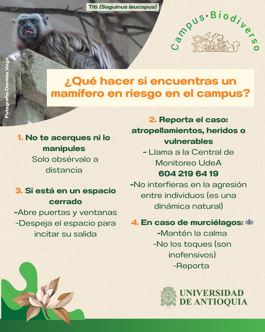 La Fauna que habita los Campus de la Universidad de Antioquia, incluyendo aves, mamíferos, reptiles y anfibios, interactúan activamente con la infraestructura y las actividades humanas dentro de los campus universitarios. Desde el proceso de Sostenibilidad Ambiental Adscrito a la División de Infraestructura y Logística se realiza el direccionamiento y atención primaria de fauna silvestre de manera responsable, segura y efectiva a individuos juveniles, heridos, desorientación o en estado de vulnerabilidad, facilitando el direccionamiento adecuado, el acopio temporal y la articulación con las autoridades ambientales competentes para la atención primaria. Todo ello bajo un enfoque de bienestar animal, prevención de riesgos y compromiso con la biodiversidad.