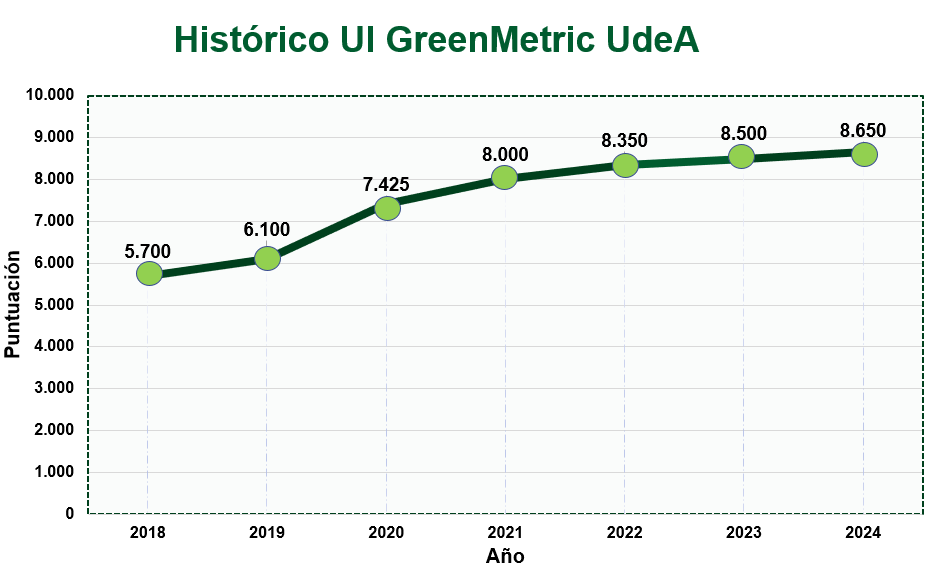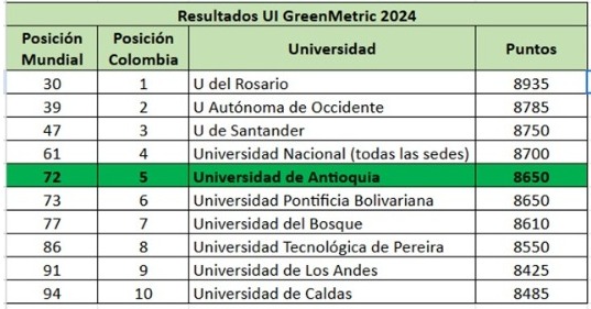 La Universidad de Antioquia obtuvo 8.650 puntos, 150 puntos adicionales respecto al año 2023, ocupando el 5 puesto en Colombia y el 72 a nivel mundial, de las 1477 instituciones de educación superior de 95 países que fueron evaluadas. Estos resultados reflejan la sumatoria de esfuerzos que la Universidad realiza en la gestión ambiental y sostenible de los Campus universitarios. Reporte UI GreenMetric