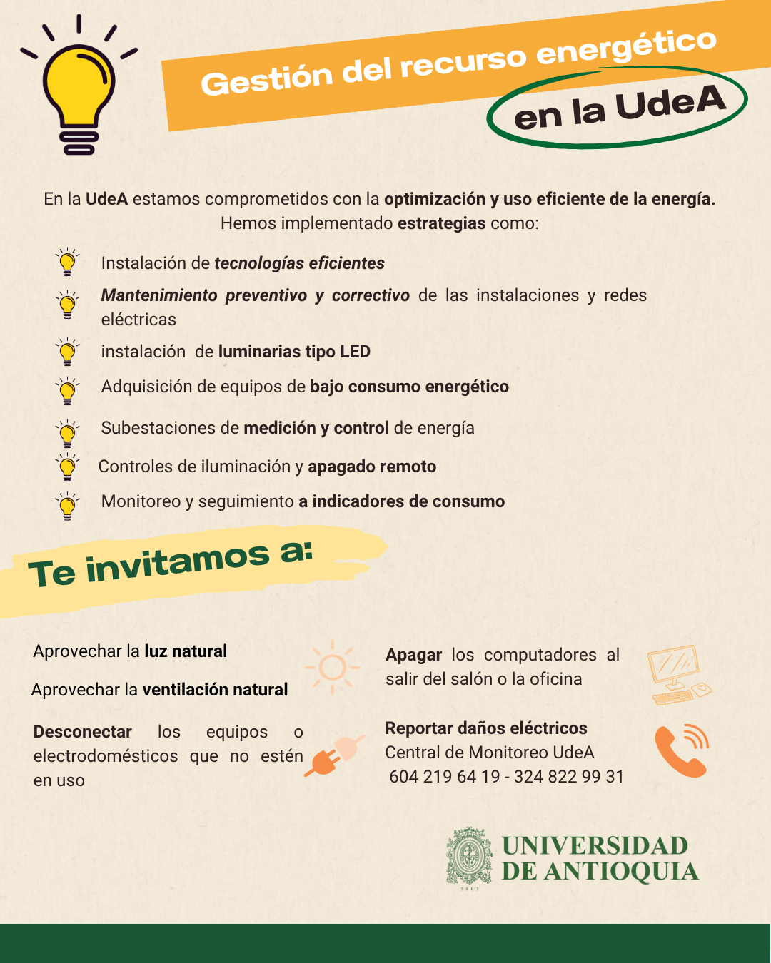La universidad de Antioquia cuenta con un programa para la gestión y uso eficiente del recurso energético, mediante el cual se implementan estrategias de planificación, ejecución y monitorización de acciones para optimizar el uso y consumo de la energía, buscando reducir costos, mejorar la eficiencia y mitigar los impactos ambientales adversos.