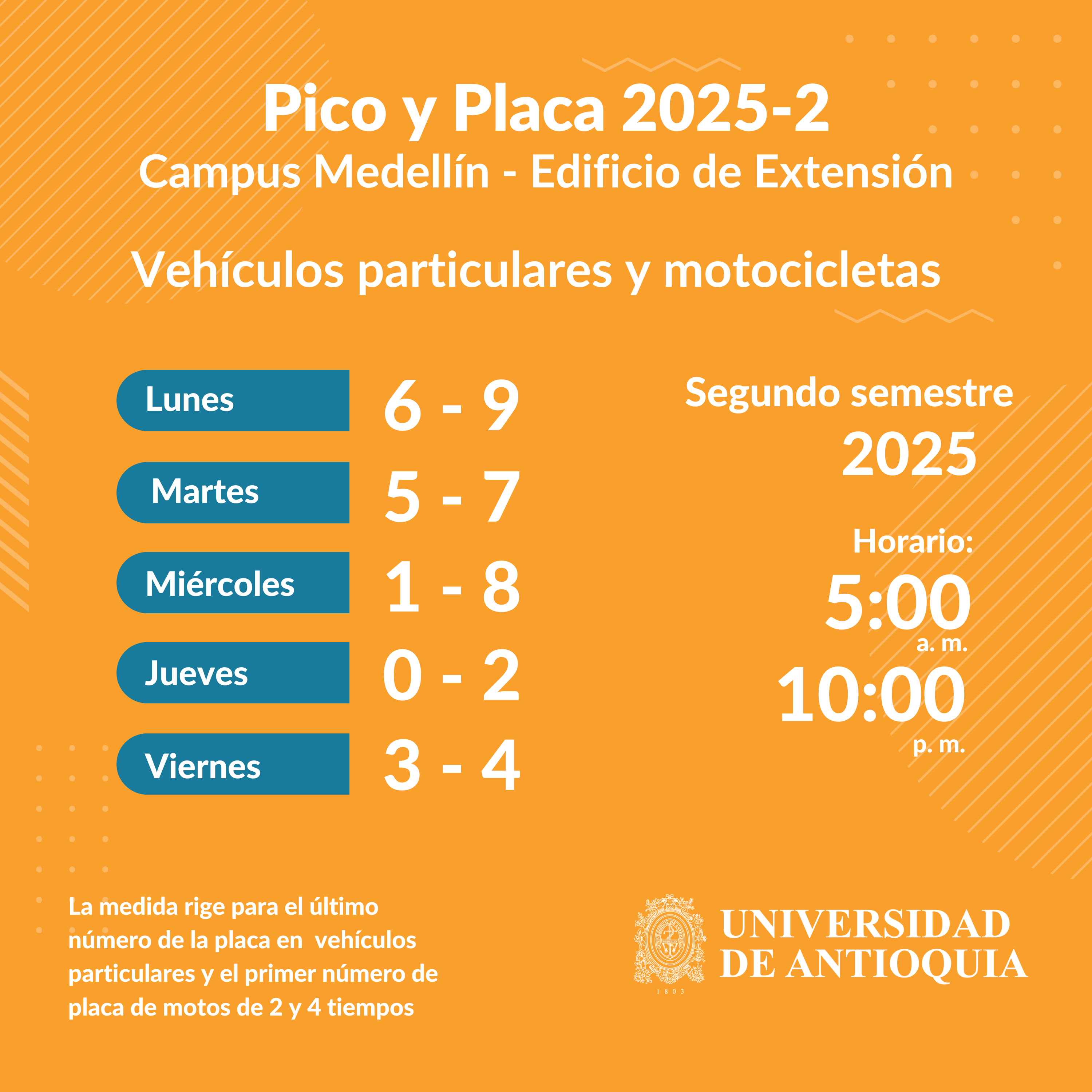 A partir del lunes 4 de agosto de 2025 los automóviles particulares y las motos que tengan restricción en el Área Metropolitana del Valle de Aburrá por pico y placa, el día designado por las autoridades locales, no se les permitirá el ingreso a la Ciudad Universitaria, Campus Medellín ni al Edificio de Extensión en el horario de 5:00 a.m. a 10:00 p.m.