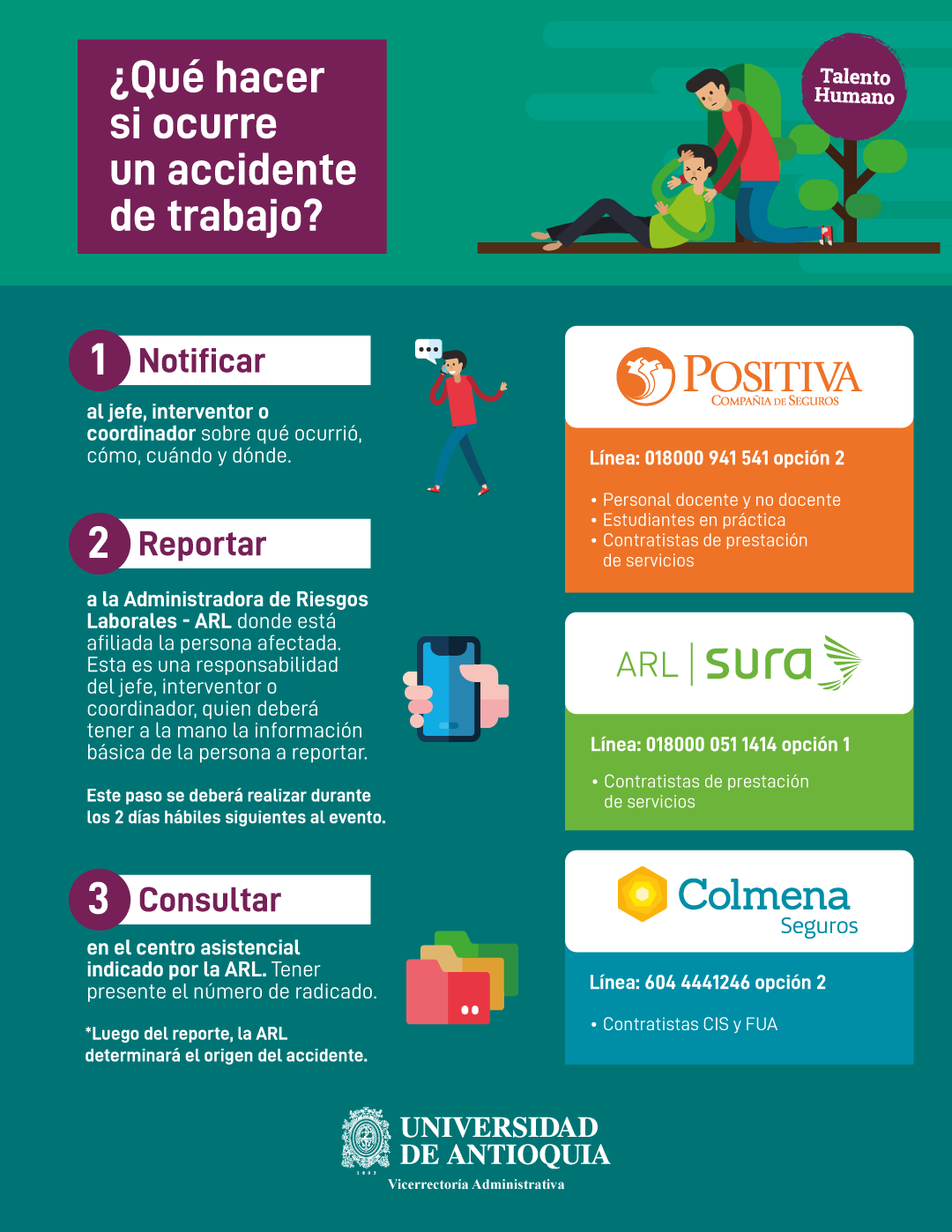 En el artículo 3 de la ley mencionada podrá conocer todos los aspectos que definen el alcance y cobertura del accidente de trabajo y a continuación podrá conocer lo que se debe hacer cuando se presenta un posible accidente de trabajo en la Universidad de Antioquia: