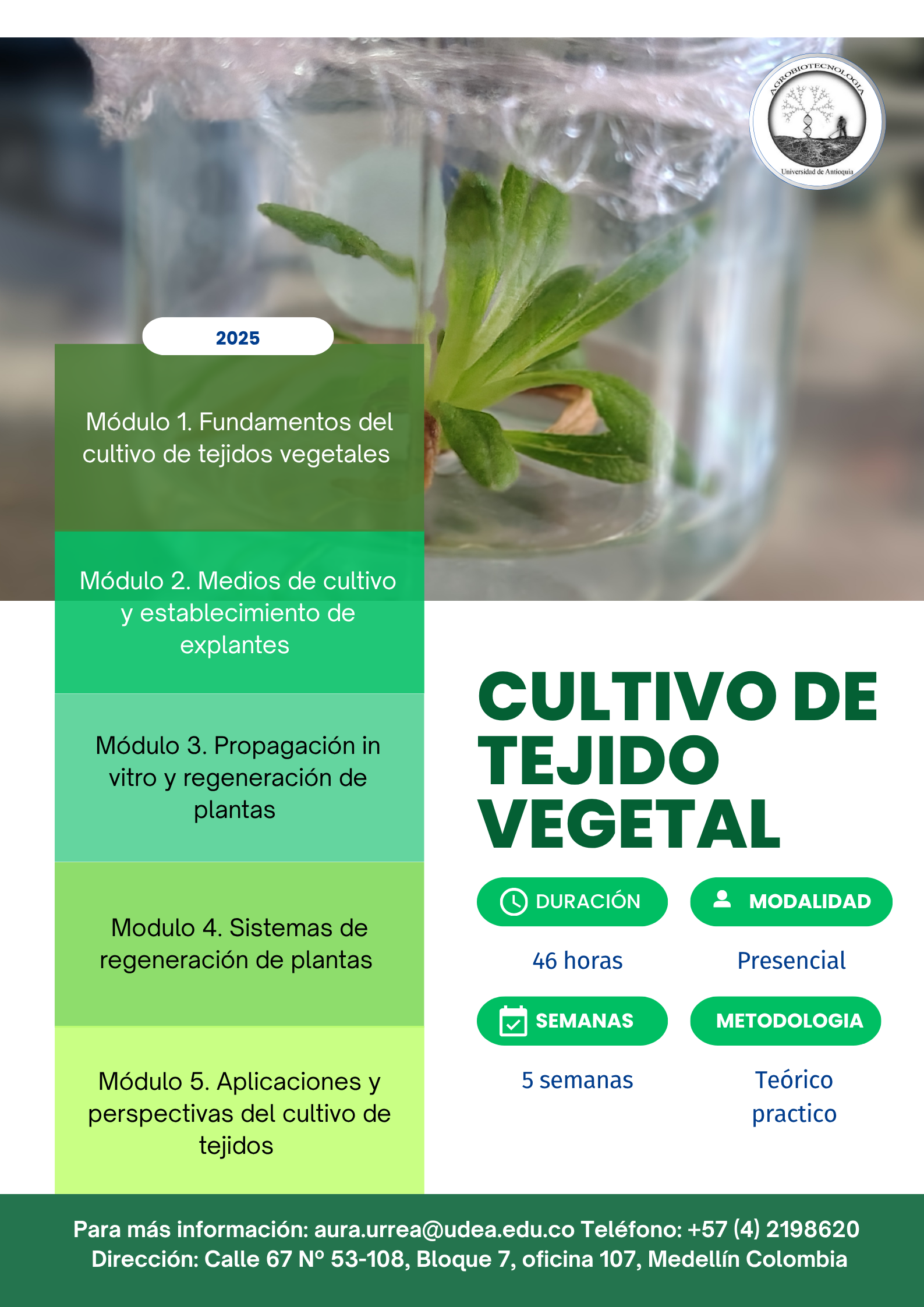 Comprender los fundamentos teóricos y prácticos del cultivo de tejidos vegetales, sus aplicaciones en saneamiento, micropropagación, mejoramiento, producción de metabolitos entre otros, a través de prácticas de laboratorio básicas que permitan la familiarización con las técnicas más utilizadas.