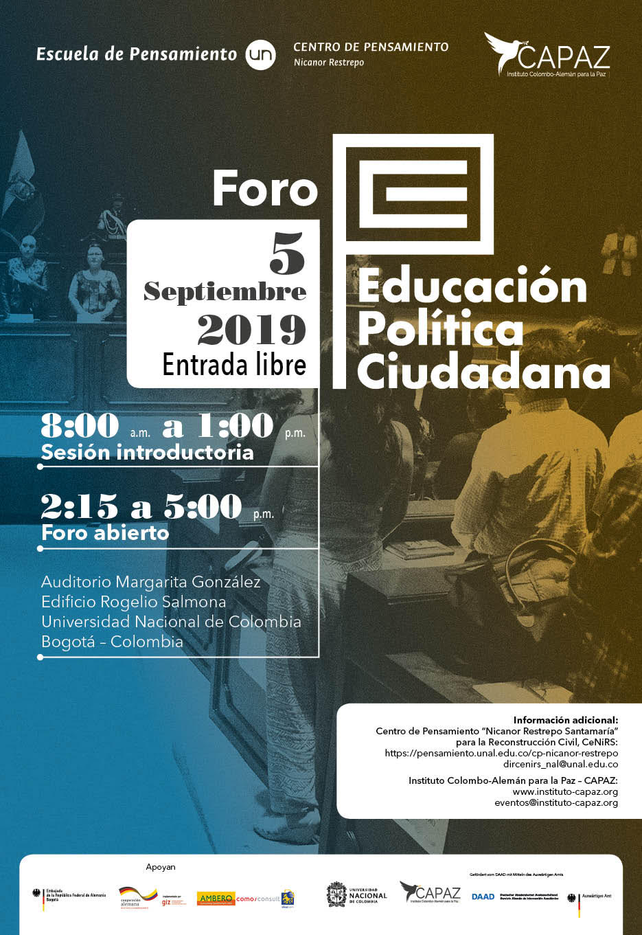 El jueves, 5 de septiembre de 2019, en el auditorio del Edificio Rogelio Salmona de la Universidad Nacional en Bogotá tendrá lugar el foro abierto al público. La entrada es libre.