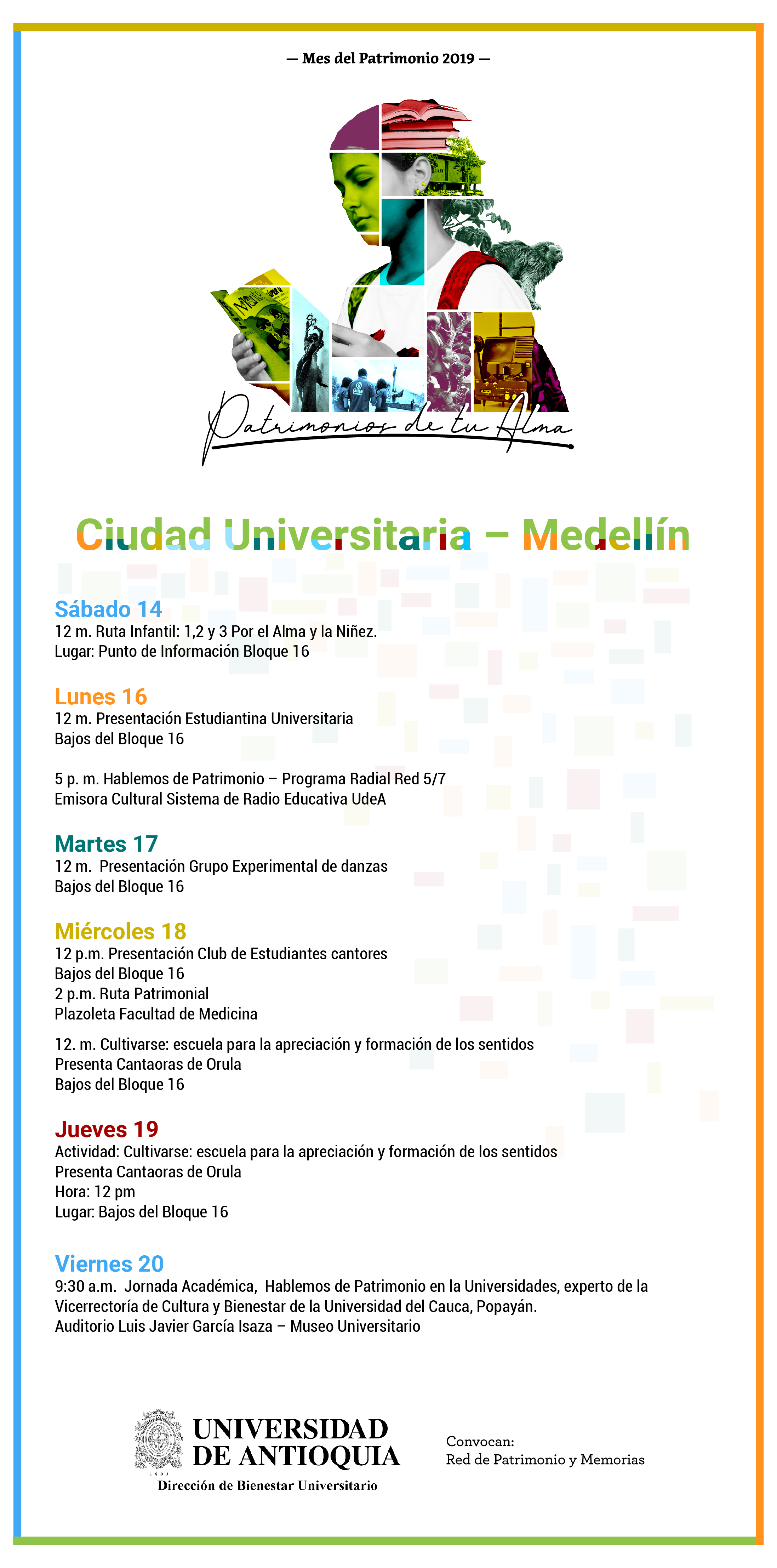 Música, charlas y otras actividades harán parte de la programación que el Mes del Patrimonio 2019 tiene organizada para las diferentes sedes de la Universidad de Antioquia. ¡Consúltala aquí!