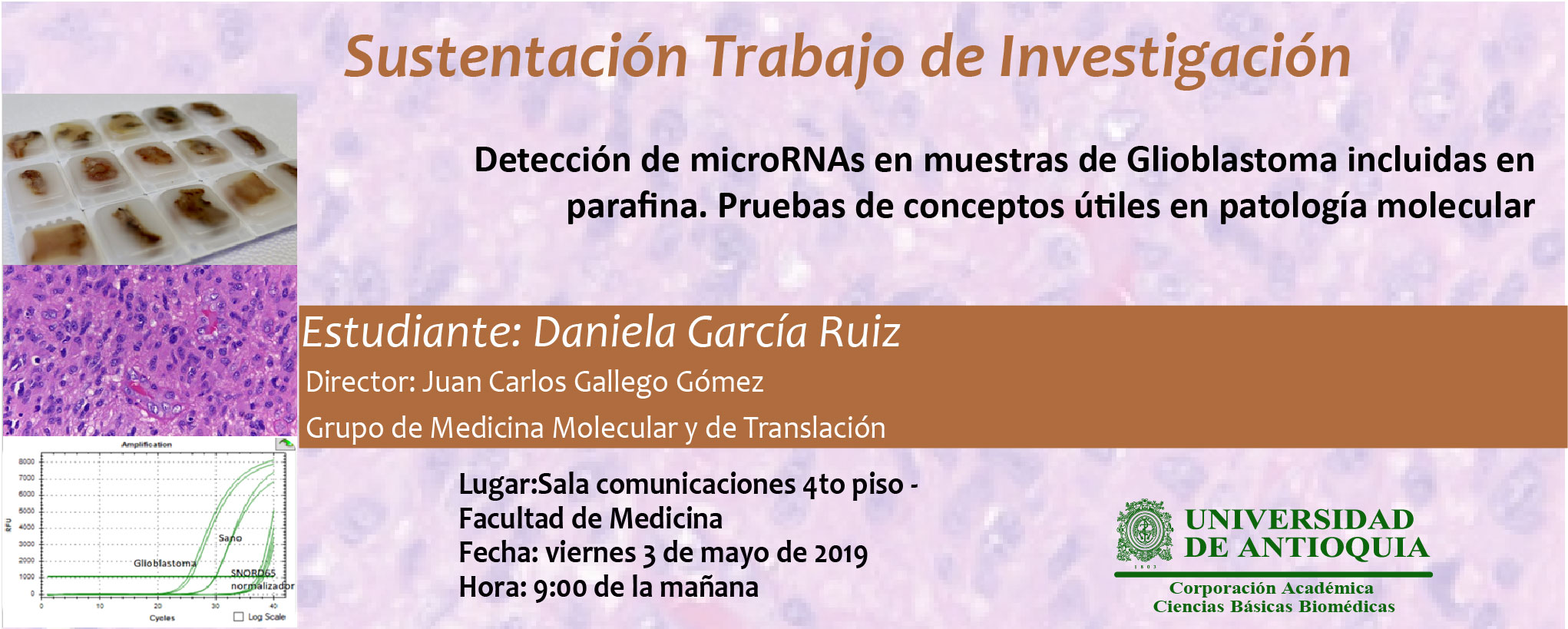 La Corporación Académica Ciencias Básicas Biomédicas y el Grupo de Investigación de Medicina Molecular y de Translación de la Universidad de Antioquia- invitan a la Sustentación del trabajo de investigación de Daniela García Ruiz