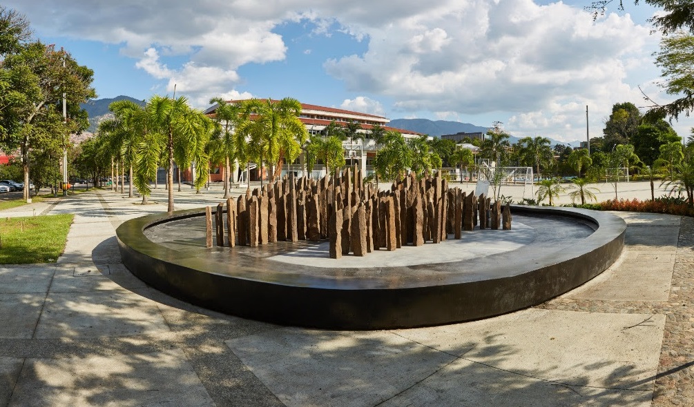 La escultura Oriente se compone de 215 pórfidos, un homenaje a los 215 años de la Universidad de Antioquia. La obra del artista Hugo Zapata se integra al museo abierto del Campus. Foto: UdeA Noticias.