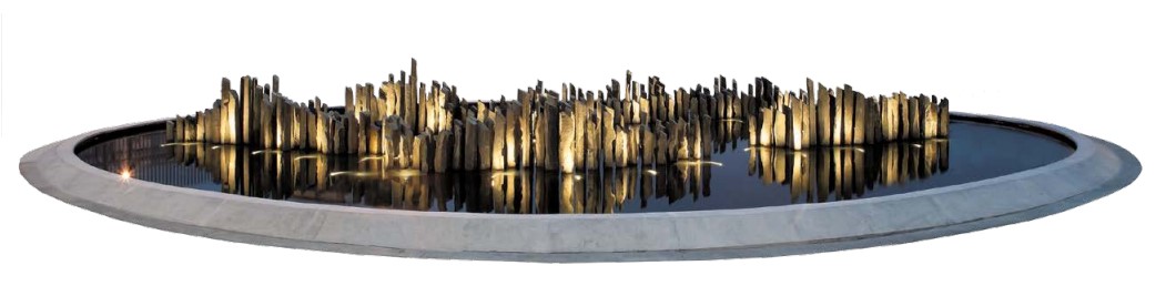 El basalto es la expresión del fuego, el amo de los subsuelos marinos. En el color negro que lo reviste, fulguran tonos púrpura, verdes, grises y aún azules, dependiendo del observador. Acompañando la solidez de las piezas, aparece el espejo de agua, que permite el reflejo del cielo.