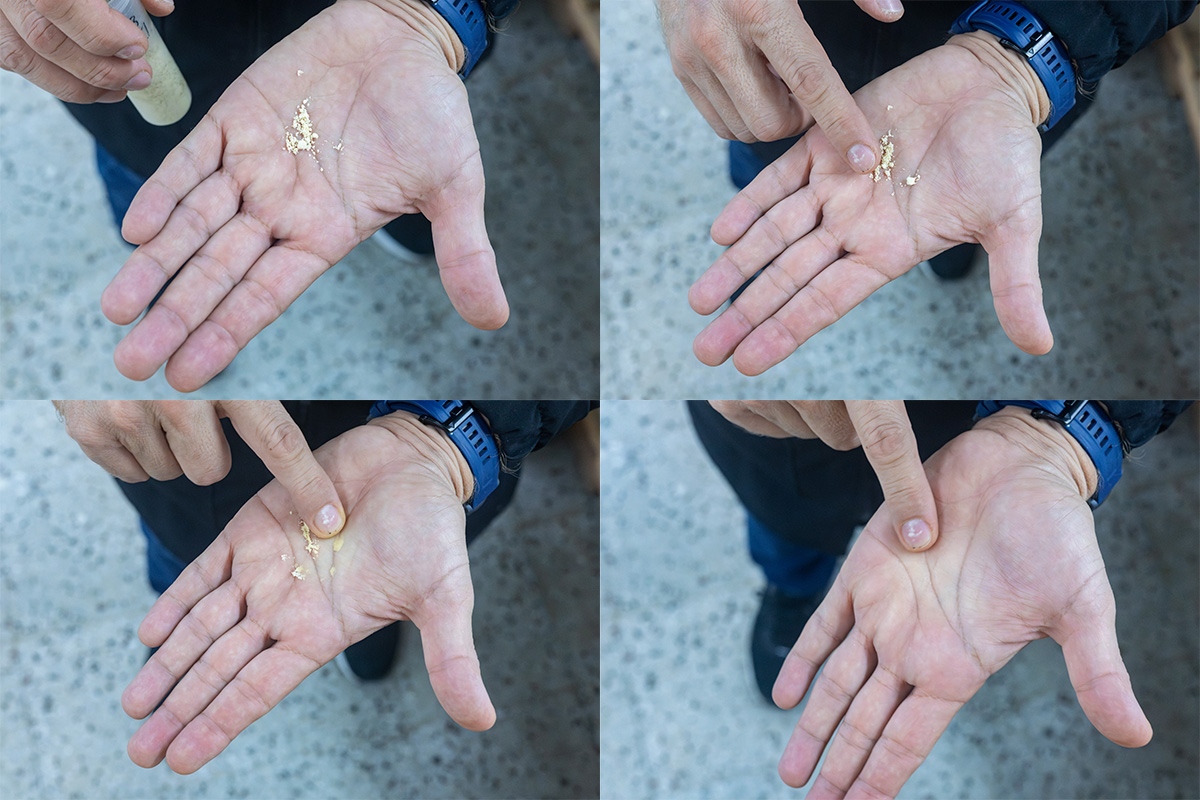 Secuencia de cuatro imágenes que muestran una mano sosteniendo y frotando un material sólido recubierto mediante el proceso desarrollado por el grupo Coloides de la UdeA. En la primera imagen se observa el sólido sobre la palma; en las siguientes, la persona lo presiona y lo dispersa, hasta que el material se vuelve oleoso y se absorbe en la piel. La serie ilustra cómo el recubrimiento permite el intercambio de sólidos insolubles en una textura similar a aceite al contacto, mostrando la funcionalidad del proceso patentado. Foto: Dirección de Comunicaciones UdeA / Alejandra Uribe F.