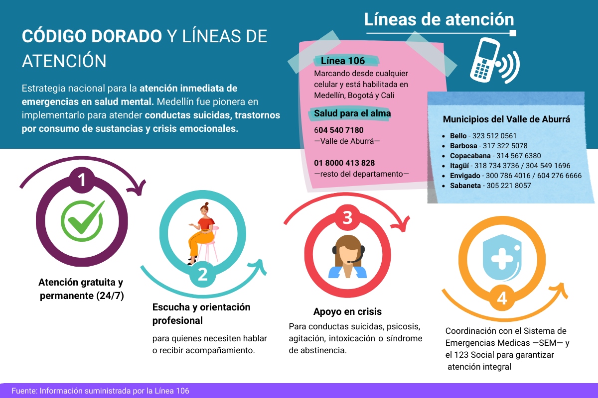 En Medellín, la situación no es ajena a esa tendencia. De acuerdo con el Informe de calidad de vida 2020–2023, se reportó un aumento significativo en el número de consultas por trastornos de ansiedad y depresión: entre 2019 y 2021, el incremento fue del 71 % y del 60 %, respectivamente. Además, la Encuesta de Percepción Ciudadana 2023 reveló que el 26 % de los habitantes calificó su salud mental como regular o mala. En ese mismo sentido, otros indicadores asociados a este fenómeno muestran que también persiste una tendencia al alza en los casos de intento de suicidio en el Distrito.