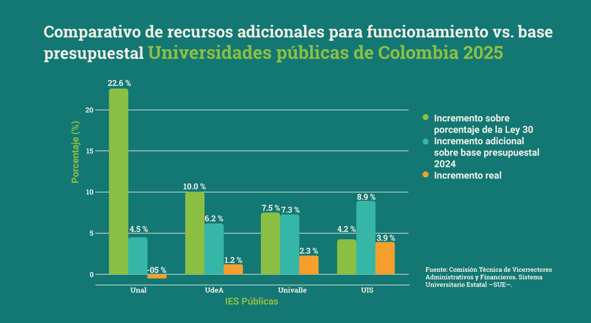 Para 2025 la Unal recibirá un 22.6 % de las transferencias que se hacen por lo que ordena la Ley 30 de 1992 —ley de educación superior—, la UdeA un 10 %, la del Valle un 7.5 % y la UIS un 4,2 %. Al desglosar el porcentaje adicional sobre la base presupuestal de 2024, el documento del SUE mostró que este es de 4.5 % para la Nacional, de 6.2 % para la de Antioquia, de 7.3 % para la del Valle y de 8.9 % para la de Santander. Más en detalle, el informe del SUE destacó que el incremento real de la base presupuestal de 2024 respecto al presupuesto de este año es de -0,5 %, es decir, negativo para la mayor universidad pública del país, la Unal; de 1.2 % para la UdeA, la segunda universidad pública del país y la primera de Antioquia; de 2.3 % para la del Valle y de 3.9 % para la UIS.