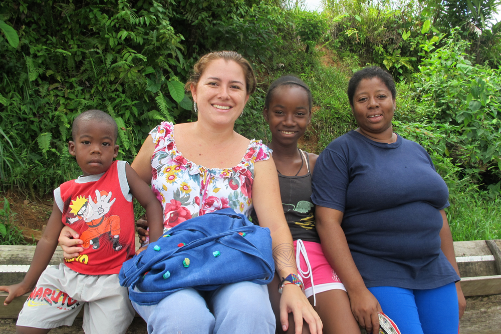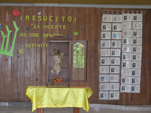 La investigadora Natalia Quiceno con habitantes de Bojayá. Foto: Periódico Alma Máter. Foto secundaria: Cristo mutilado.