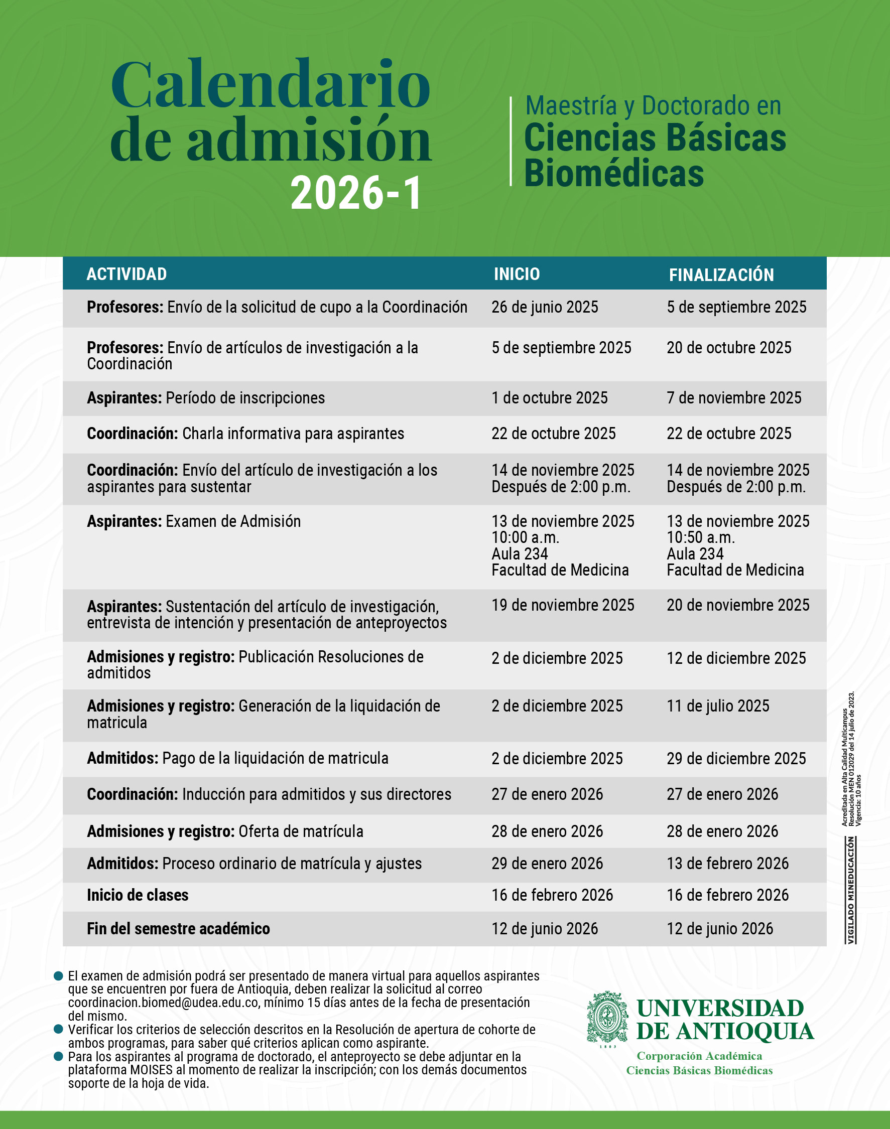 Calendario del proceso de admisión 2026-1: