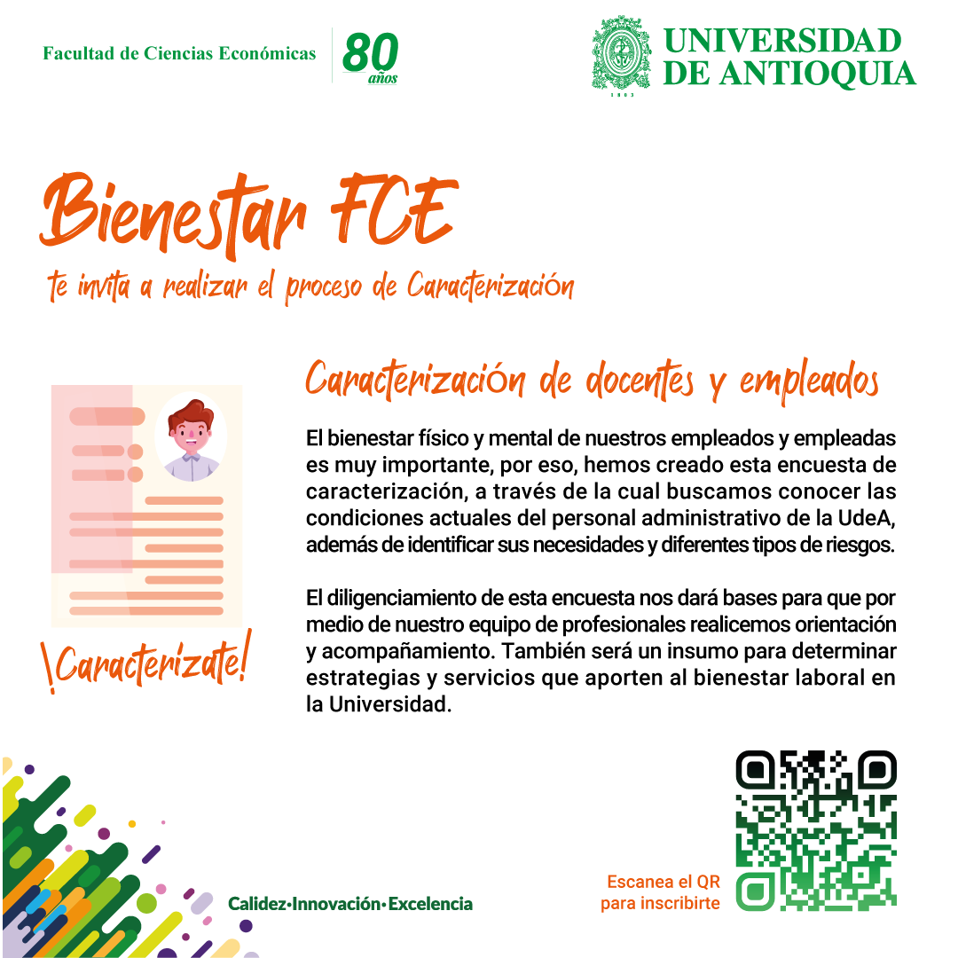 Los programas del Sistema de Bienestar Universitario y que en la FCE están a cargo de la Coordinación de Bienestar, son extensivos a las diferentes sedes donde la Facultad tiene presencia y buscan generar calidad de vida en los procesos laborales y académicos de toda la comunidad universitaria, aportar a la formación integral y fortalecer el sentido de comunidad a través de diferentes actividades y servicios que se planean desde los departamentos de Deportes, Desarrollo Humano, Promoción de la Salud y Prevención de la Enfermedad.