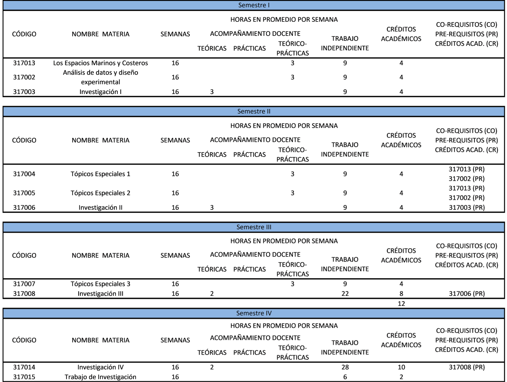 Los cursos Tópicos especiales I, II y III, son cursos específicos de cada línea de formación y serán programados por el grupo de investigación al cual pertenece el estudiante. El Posgrado podrá ofrecer Tópicos especiales en temas avanzados en Ciencias del Mar. Todos los Tópicos especiales estarán en un banco de electivas del Posgrado en Ciencias del Mar, con la posibilidad que se propongan nuevos Tópicos especiales en cada semestre sin necesidad de solicitar modificación del presente plan de estudio. los Tópicos especiales pueden ser vistos en otras unidades académicas u otras universidades y ser homologados.