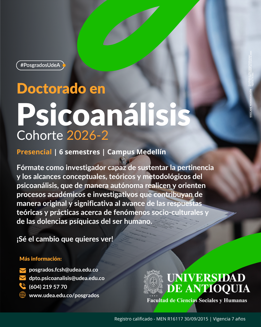 Pueden inscribirse al Doctorado en Psicoanálisis aquellos profesionales que tengan título de Maestría, preferiblemente en Psicoanálisis (o en Ciencias Sociales y Humanas, Filosofía, Letras o Ciencias de la salud) o demostrar la condición de estudiante coterminal de maestría, según lo establecido por el numeral 8 de las “Políticas de Posgrados en la Universidad de Antioquia” (Acuerdo Académico 294 del 26 octubre de 2006).