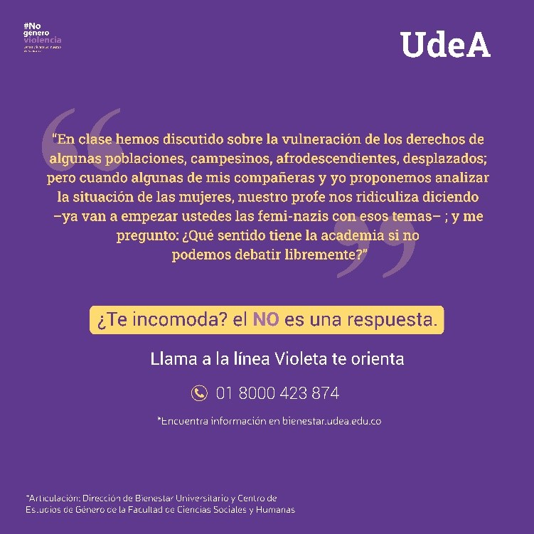 Habla, busca apoyo y orientación. Recuerda que desde la Universidad disponemos de canales de atención para escucharte. Llama a la Línea Violeta te orienta 01 8000 423 874 o escribe al correo electrónico atencionvgs@udea.edu.co