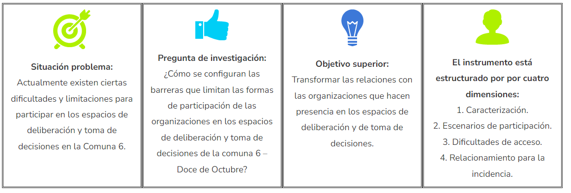 El Centro de Estudios para la Participación Ciudadana (CEPAC) recopiló información sobre la situación de la participación en 100 organizaciones de la comuna 6. En 2023, el equipo de la UdeA llevó a cabo la sistematización de las encuestas, y posteriormente se creó una plataforma para la presentación de datos. Este año, la plataforma fue mejorada para ofrecer una visualización más interactiva y estratégica, proporcionando una descripción más detallada de los datos. A continuación, se puede acceder a la actualización del tablero de datos mediante el aplicativo Power BI de Microsoft: