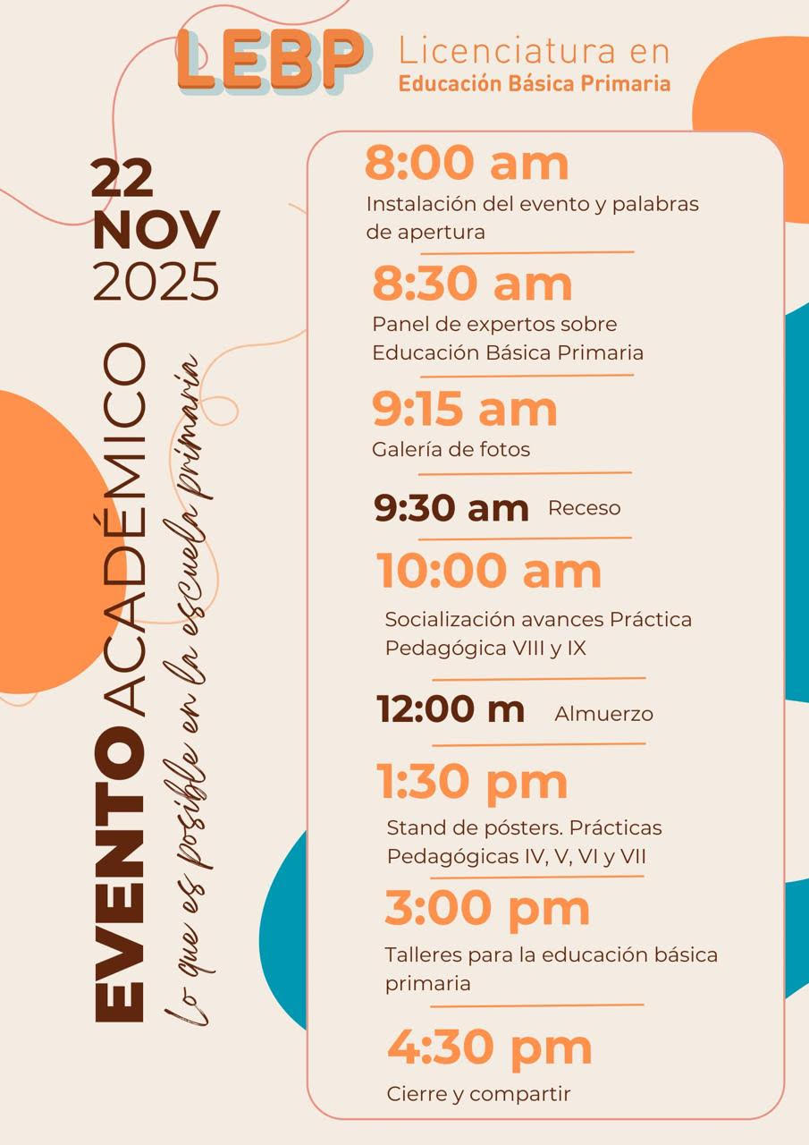 La Licenciatura en Educación Básica Primaria realiza al finalizar su semestre académico, un evento que reúne a profesoras/es y estudiantes, con el propósito compartir las reflexiones, experiencias y aprendizajes vinculados con la educación básica primaria. En el marco de este evento, se realiza la socialización de prácticas, un panel central con expertos y una serie de talleres que profundizan en la enseñanza en la escuela primaria. Estos talleres son realizados por los mismos estudiantes de la licenciatura, así como por docentes invitados de otros programas de la Facultad de Educación.