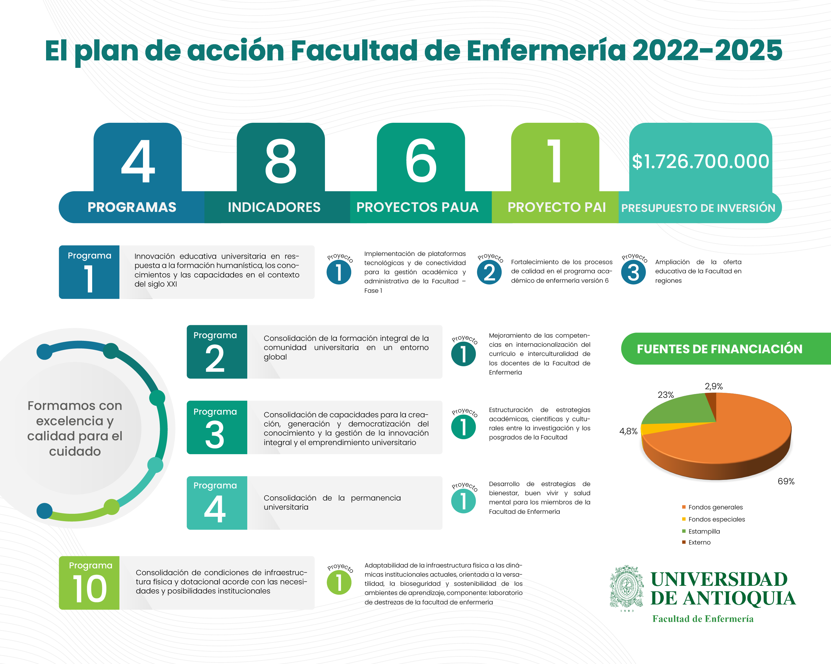 Acogemos el nuevo Plan de Acción de la Facultad de Enfermería “Formamos con excelencia y calidad para el Cuidado” . Este fue aprobado mediante la Resolución Superior 49560 del 5 de diciembre de 2022 y se constituye en la hoja de ruta de la Institución para los próximos tres años, en sintonía con el Plan de Desarrollo Institucional 2017-2027.
