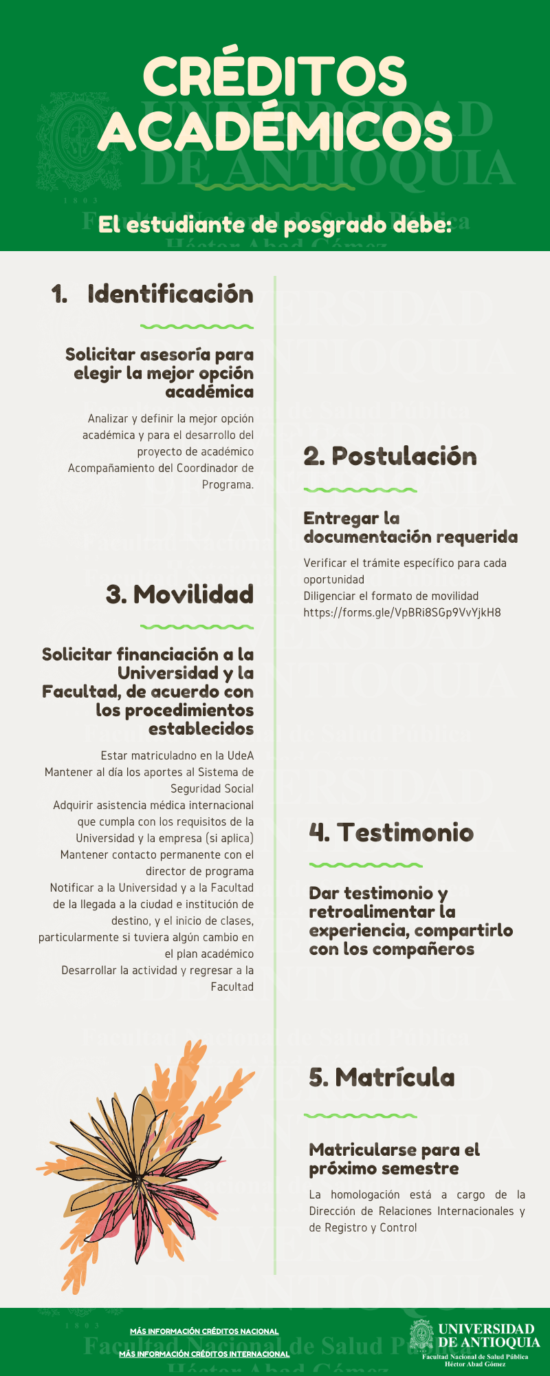 Al cumplir con los requisitos de cada convocatoria, los estudiantes de posgrado pueden cursar, algunos créditos del programa académico en otra universidad de la ciudad, el país o el mundo con la cual la Universidad de Antioquia tiene convenio vigente específico para ello.